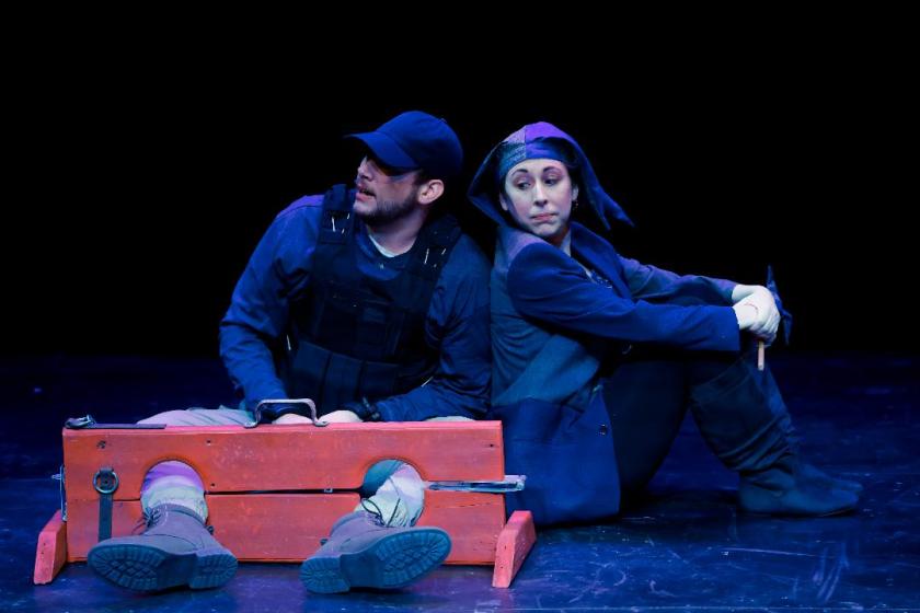 Fair Assembly’s crisp, intelligent production, was somber and wrenching. Their new space at The Latino Cultural Center Black Box, felt capacious yet personal. The cast of fifteen (not including ensemble) was striking in their understated mien. Strong emotion, yet cool to the touch. Intuitive and cunning. Whether cruel or caring, clownish or predatory, sharp or clueless, each actor was poised, with their head in the game.